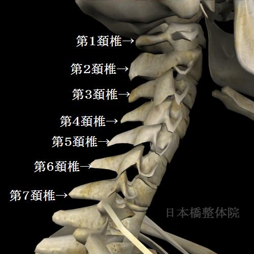 頚椎は7つの椎骨から構成されていて第1頚椎を環椎(かんつい)、第2頚椎を軸椎(じくつい)