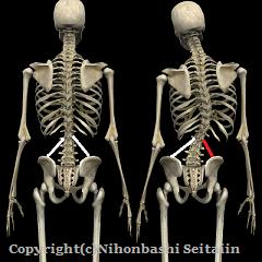 例えば、上の図のように右側の赤い筋肉が過緊張を起こし腰椎を